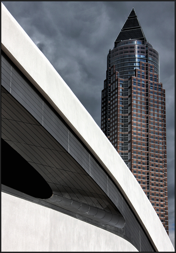 Das Gebäude mit 256,50 m war bis 1997 das höchste Bürohochhaus Europas. Die Fassade besteht aus rotem polierten Granit, was dem Messeturm eine interessante Anmutung gibt. Von den Bewohnern Frankfurts wird als „Bleistift“ genannt. |